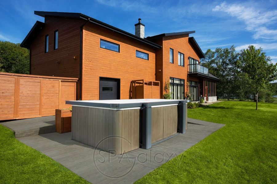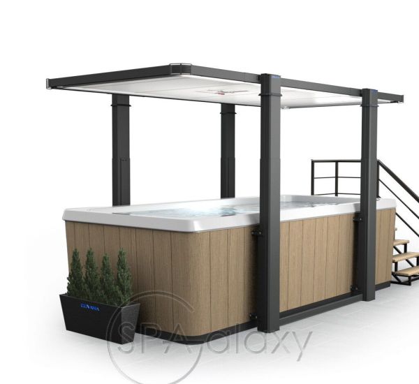 Altana Covana Legend ma dodatkową zaletę w postaci osłony przeciwsłonecznej. Gdy wanna z hydromasażem jest w użyciu, osłona tworzy prywatną i przytulną przestrzeń, chroniąc użytkowników przed wiatrem, deszczem i nadmiernym nasłonecznieniem.