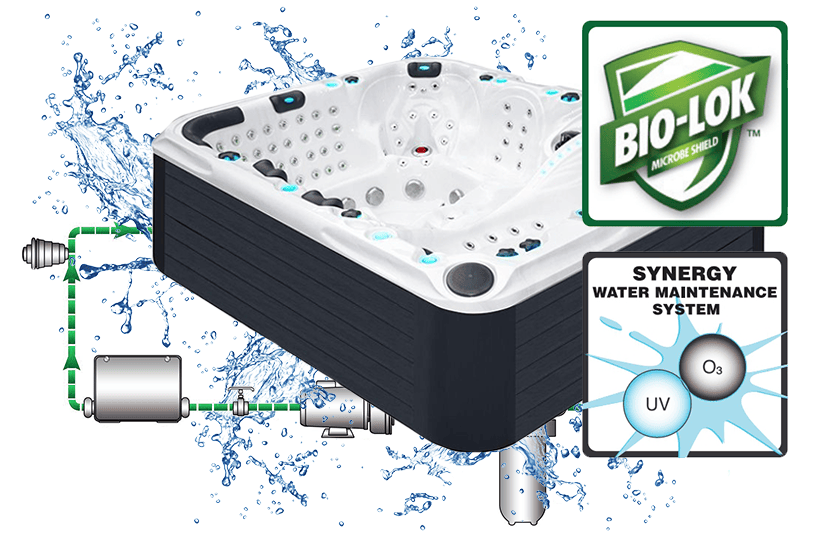 Spa Passion są wyposażone w wieloaspektowy system oczyszczania wody, który pomaga utrzymać czystą wodę i zmniejsza potrzebę dodatkowego uzdatniania wody i konserwacji. Jedynym celem naszej dedykowanej pompy filtrującej jest podawanie wody przez filtr spa, zapewniając, że woda w spa jest stale filtrowana niezależnie od tego, czy pompy masujące są uruchomione. Woda jest dezynfekowana za pomocą naszego wysoce wydajnego systemu ozonowania, a w naszych charakterystycznych i ekskluzywnych kolekcjach, dodatkowo oczyszczana za pomocą naszego systemu sanitarnego UV. Połączenie 100% filtracji, oczyszczania ozonem i oczyszczania UV tworzy nasz system utrzymania wody Synergy, który zapewnia maksymalną czystość wody.