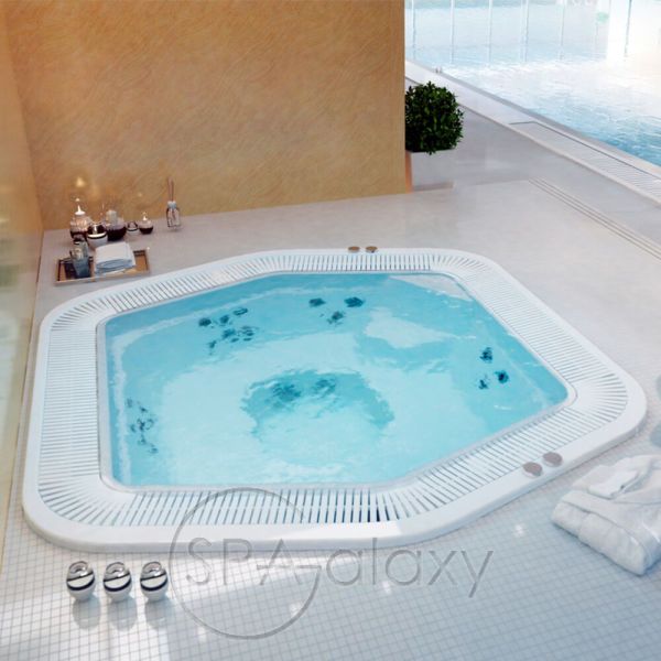 W pełni wyposażona wanna spa z rurą przelewową do użytku komercyjnego. Sprzęt jest przeznaczony do transportu na paletach.